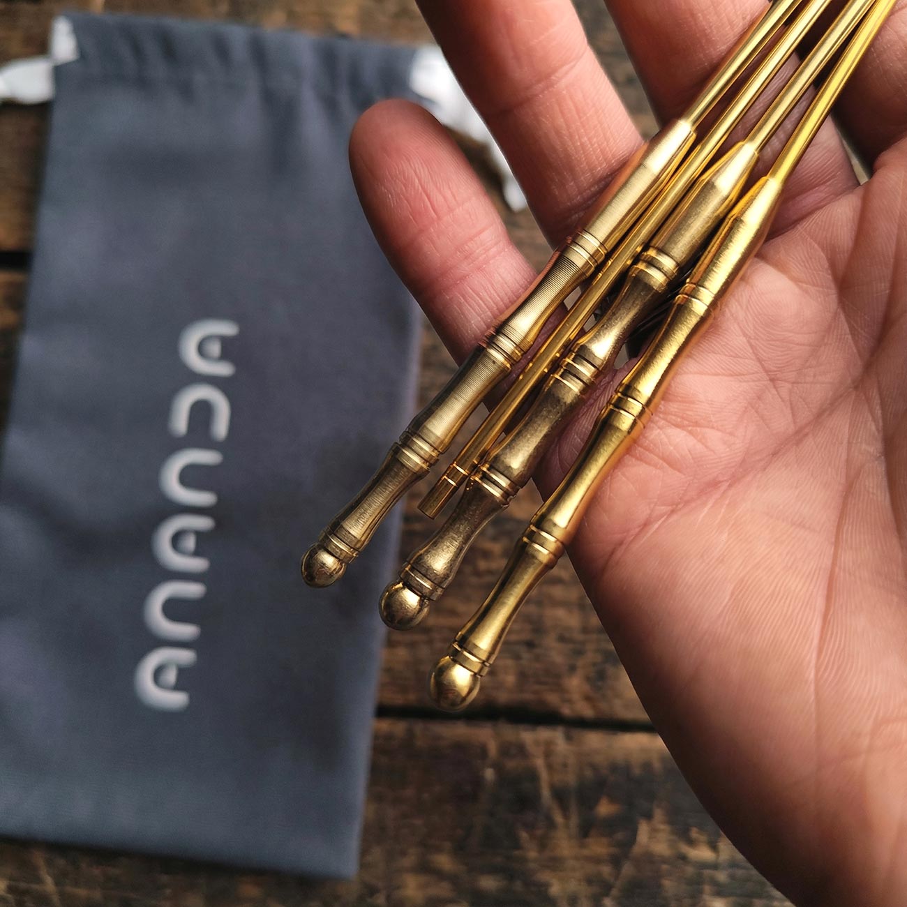 Этот премиальный набор из четырех предметов изготовлен из высококачественной, увесистой латуни. Обратите внимание на изящный дизайн ручек: они стилизованы под стебли бамбука. В восточной философии бамбук олицетворяет стойкость, благородство и внутреннюю пустоту (готовность ума воспринимать новое). Теплый золотистый блеск металла и его приятная тяжесть дарят невероятное тактильное удовольствие во время использования.