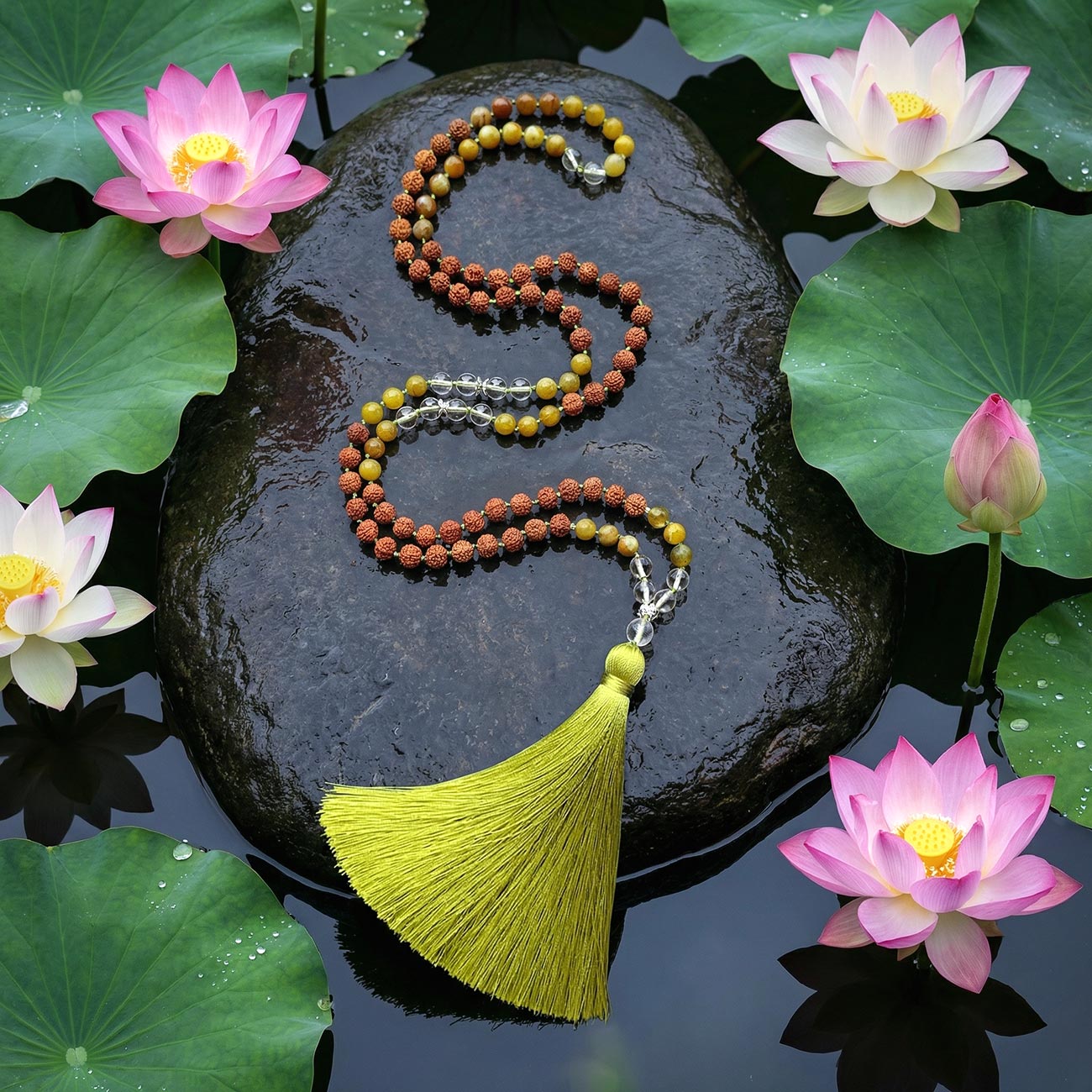 Основу малы составляют отборные бусины непальской рудракши — плодов дерева, которое в индуистской традиции считается слезами самого Шивы, пролитыми над страданиями мира. Столетиями эти зерна сопровождают йогов и садху в практике джапы: они помогают успокоить ум, удержать внимание на мантре и создать вокруг человека поле внутреннего равновесия. Непальская рудракша ценится особенно высоко благодаря плотной структуре, выразительному рельефу и глубокому теплому оттенку — в ней сразу чувствуется природная сила и благородство.