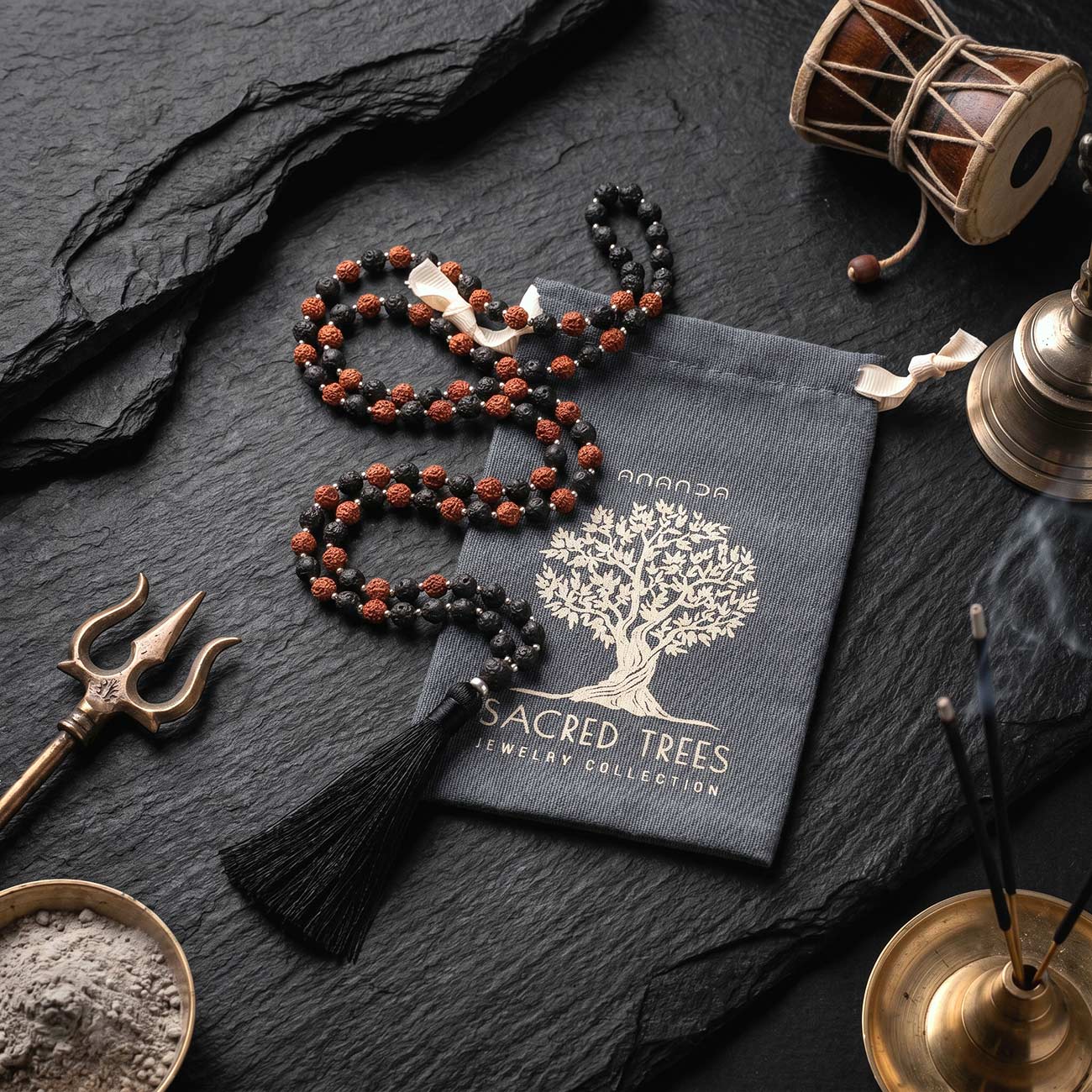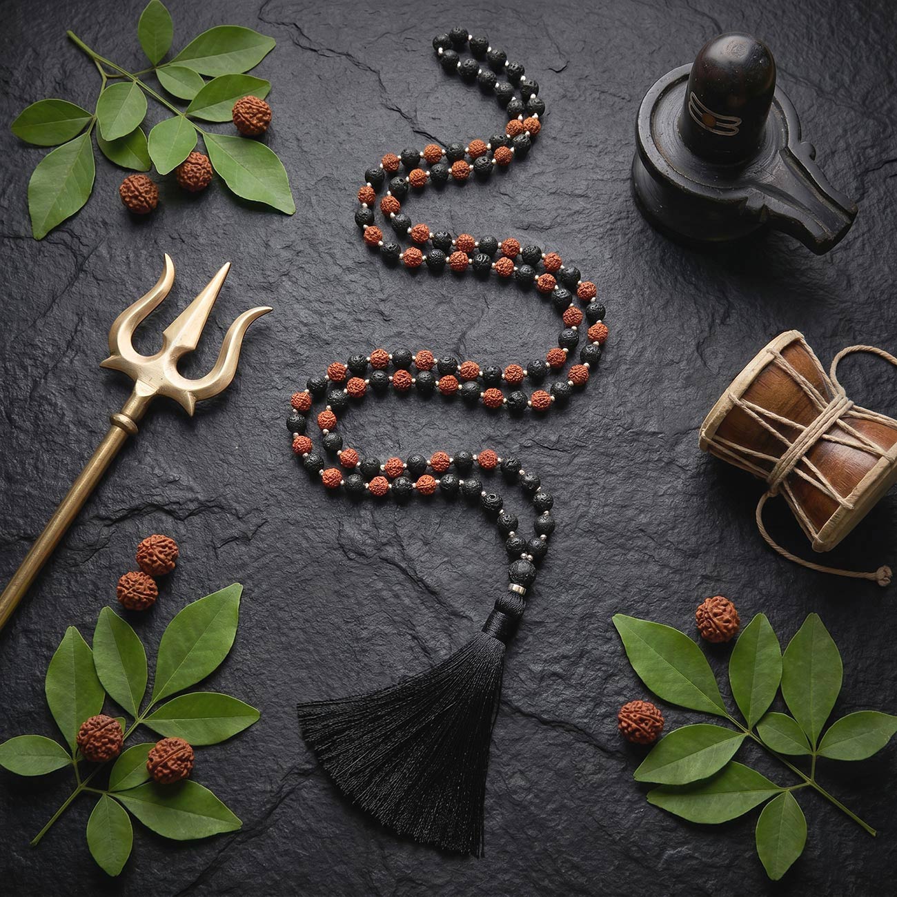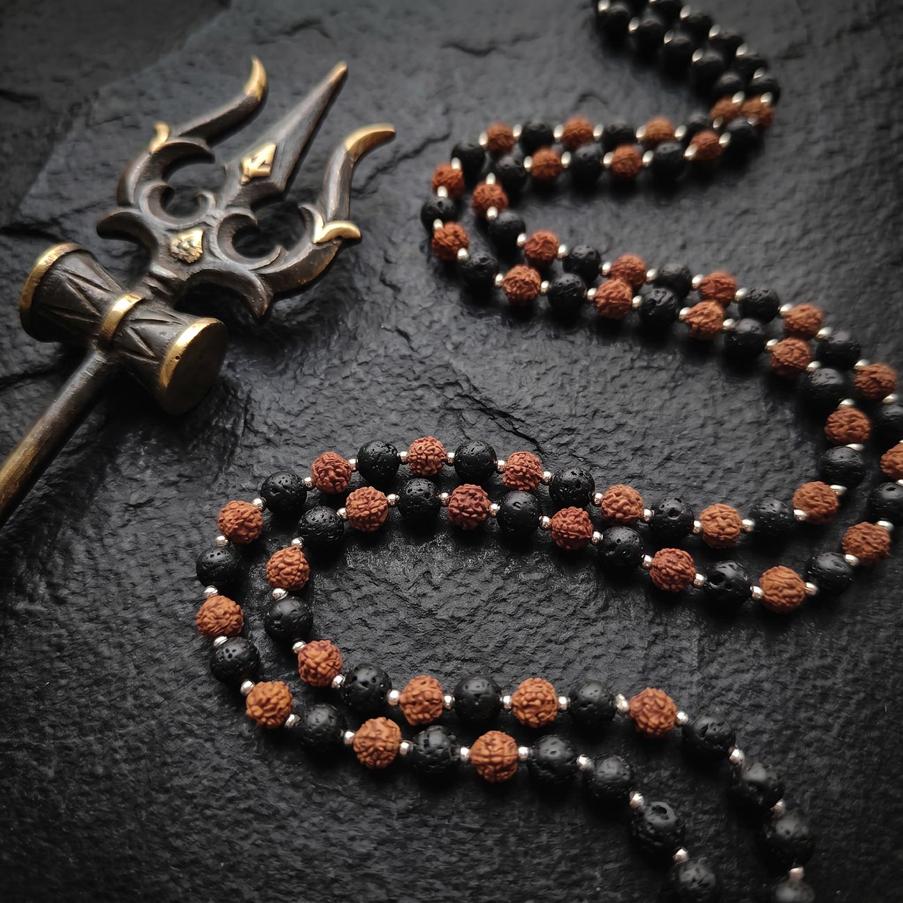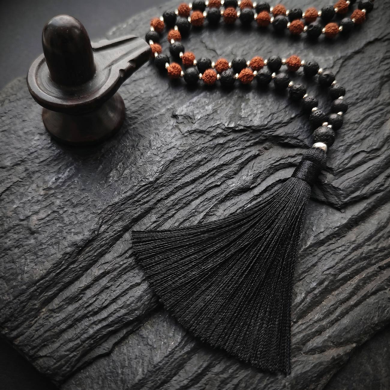 Рядом с ней — лавовый камень из Индонезии, рожденный в огне вулкана и застывший в форме, хранящей память стихии. Это камень первобытной силы, мужества и трансформации, который напоминает: любая буря в конце концов становится тишиной, а внутренний огонь — источником перемен. В сочетании рудракша и лава создают целостный образ Шивы-аскета: земля и огонь, покой и сила, зерно духа и застывшая стихия.