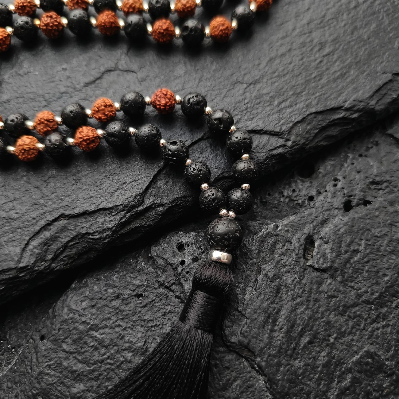 Материал: лавовый камень, рудракша, серебро 925 пробы