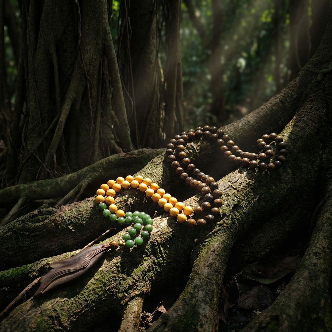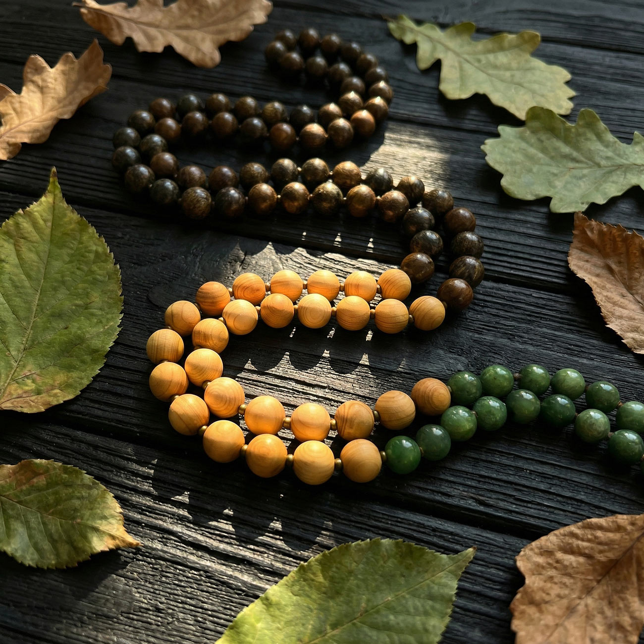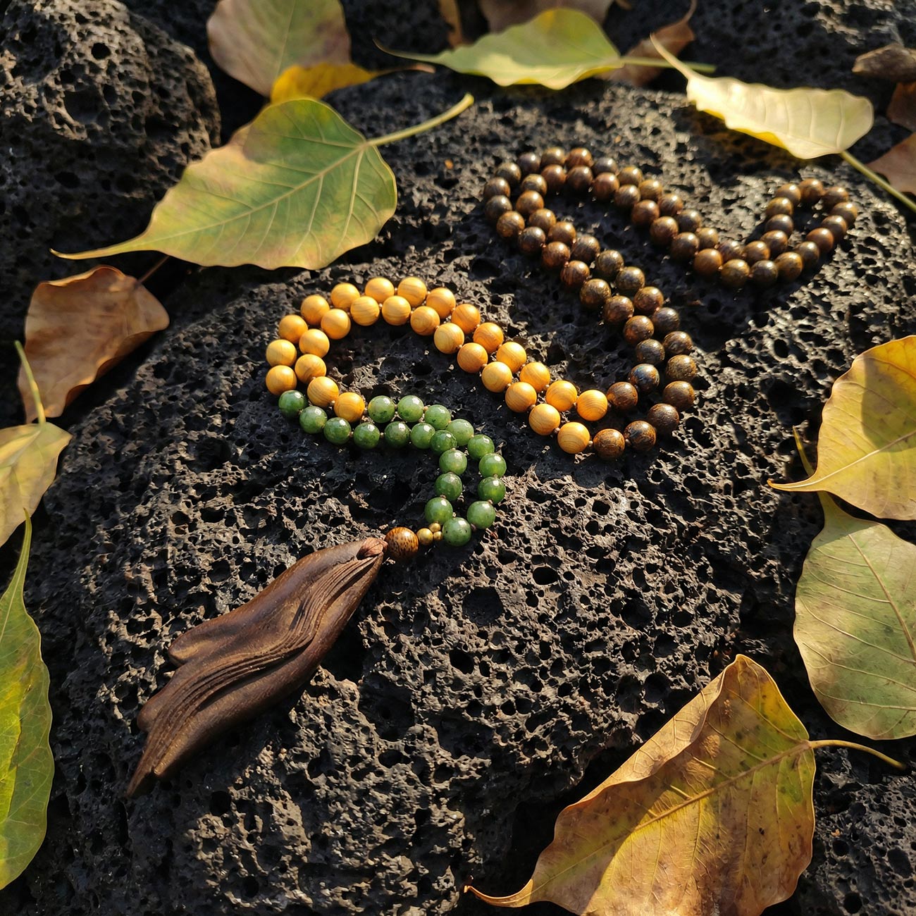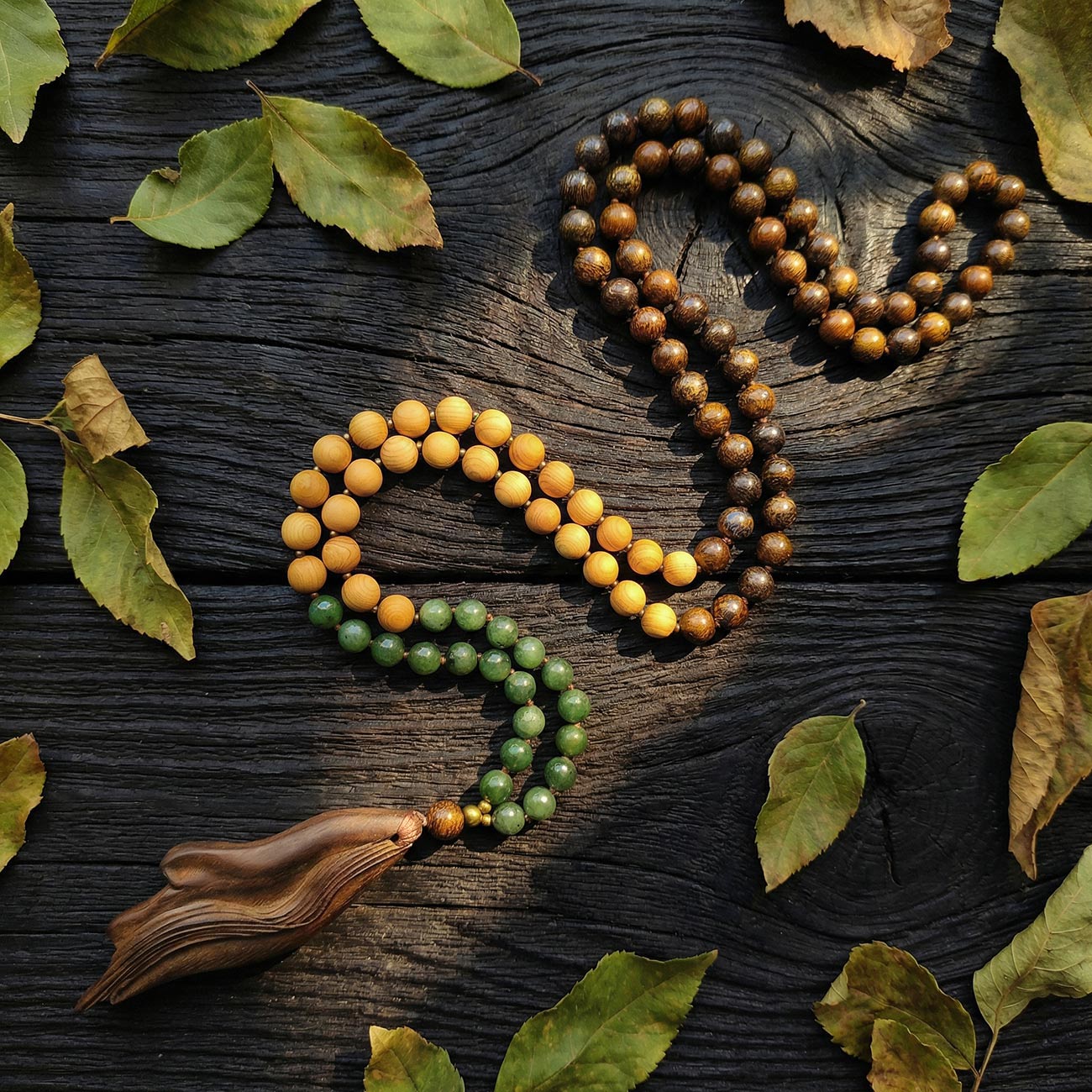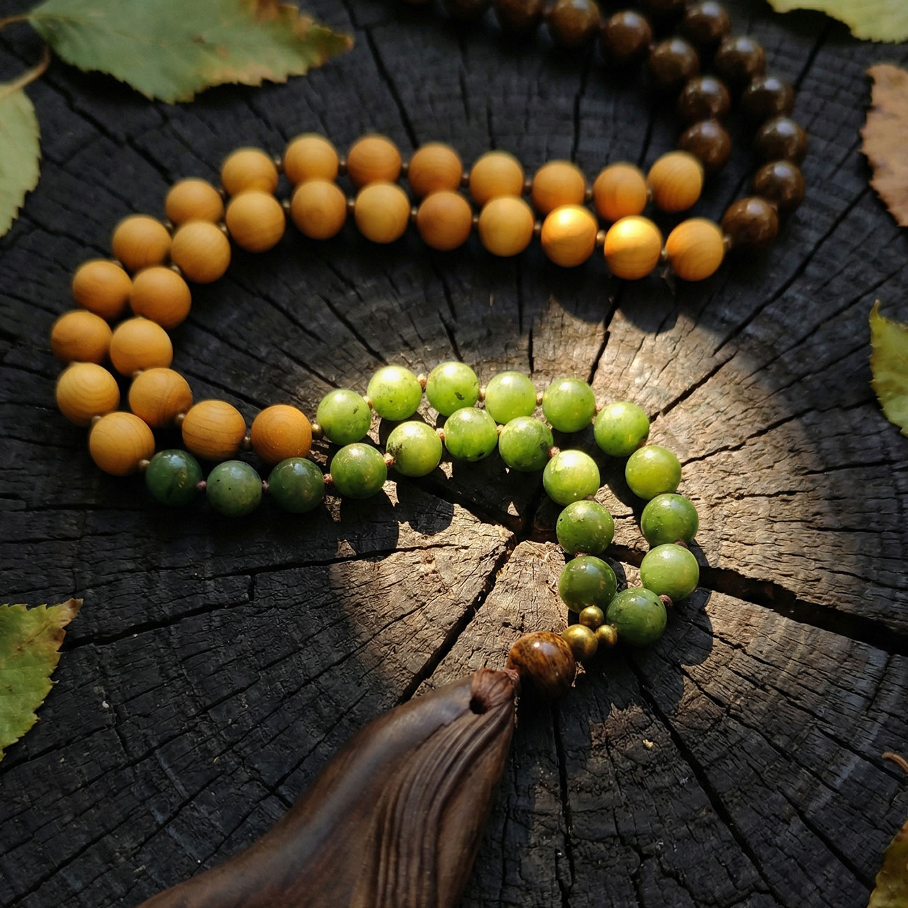 ЛИСТЬЯ: Зеленый Нефрит (Jade) Верхнюю часть малы, её «крону», формирует высококачественный нефрит глубокого, насыщенного зеленого цвета. Как листья поглощают солнечный свет, трансформируя его в энергию роста, так нефрит работает с вашей сердечной чакрой (Анахата). Это камень дыхания, жизненной силы (Prana) и эмоционального обновления. Он символизирует будущее, расцвет и способность любить, даря ощущение свежести и внутренней свободы.