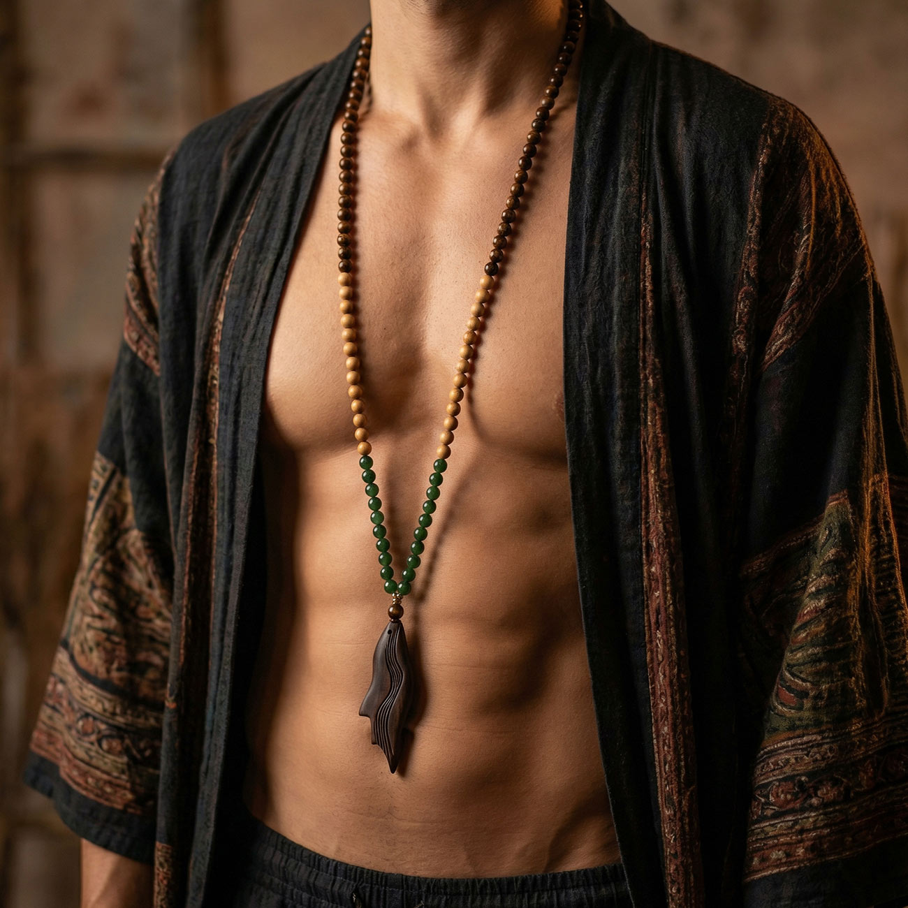 ДУША: Уд / Агаровое Дерево (Oud Wood) Завершает композицию уникальная резная подвеска из натурального удового дерева. Уд — это алхимия природы. Эта редкая древесина рождается в результате исцеления ран дерева драгоценной смолой. Она символизирует мудрость, обретенную через опыт, и трансформацию испытаний во внутреннюю силу. Его глубокий, бальзамический аромат придает изделию сакральное звучание.