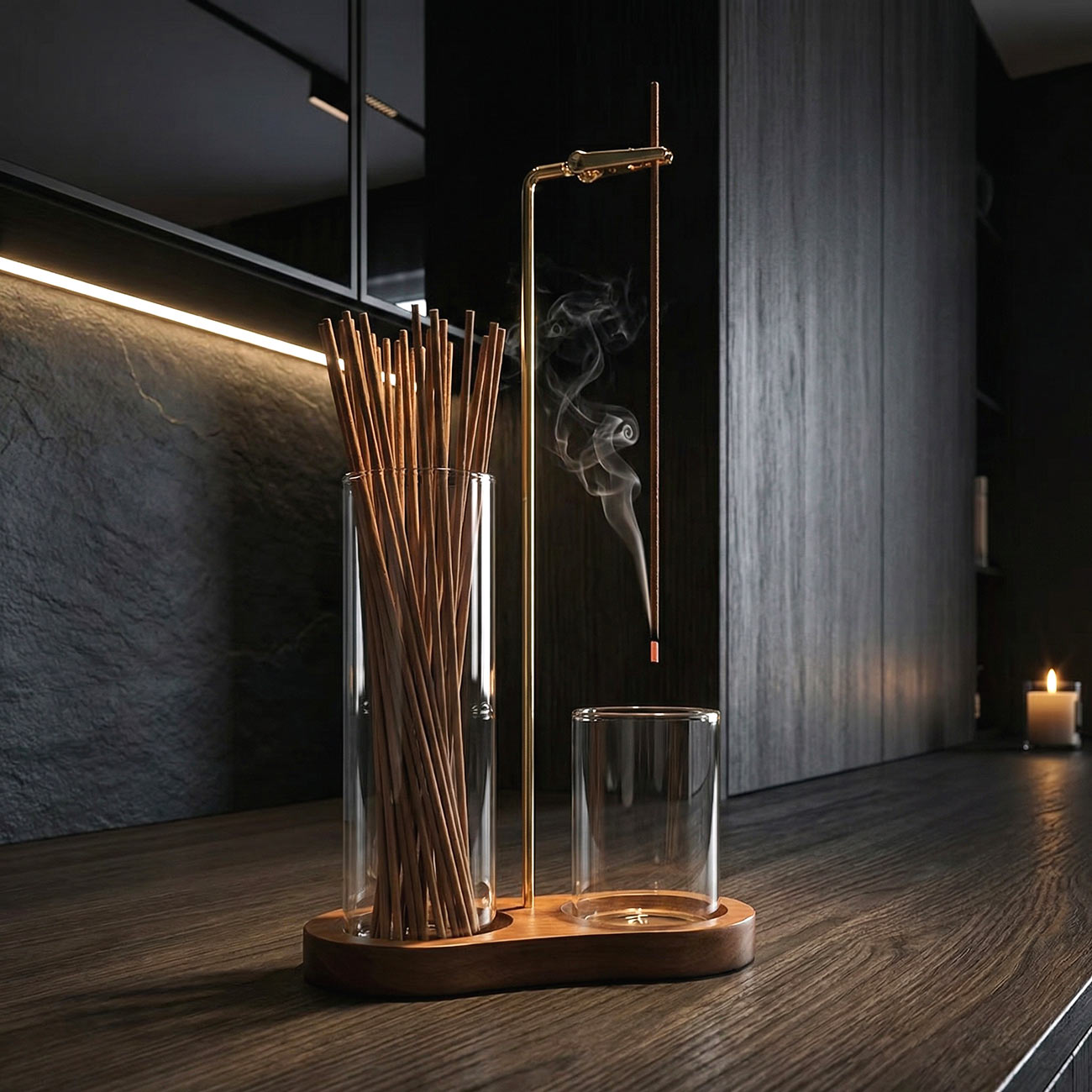 ELITE — это самая полная, продуманная и эффектная модель в линейке вертикальных подставок. Она выполнена из благородной древесины, дополнена латунным держателем и имеет два стеклянных стакана: один предназначен для тлеющей палочки и сбора пепла, а второй — для хранения самих аромапалочек. Благодаря такому решению подставка превращается не просто в аксессуар для благовоний, а в цельную, функциональную и исключительно эстетичную композицию. ELITE выглядит изысканно, статусно и гармонично, объединяя красоту материалов, удобство использования и особую атмосферу спокойствия, которую хочется сделать частью повседневного пространства.»